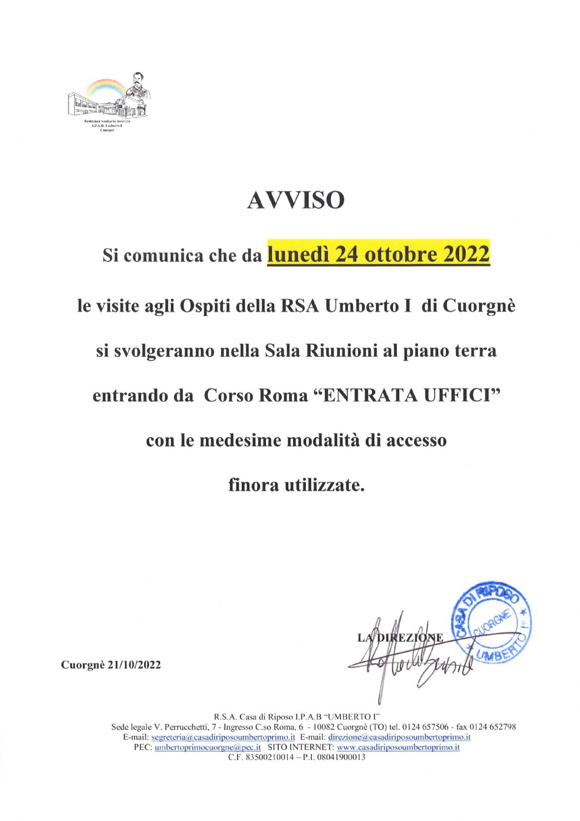 Da lunedì 24/10/2022 l'accesso per le visite agli Ospiti sarà esclusivamente da Corso Roma, ingresso Ufficio Amministrativo.